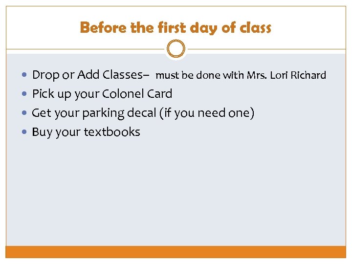 Before the first day of class Drop or Add Classes– must be done with Mrs. Lori Richard Pick up your Colonel Card Get your parking decal (if you need one) Buy your textbooks