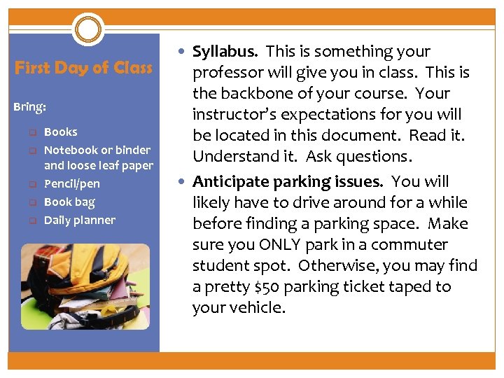 First Day of Class Bring: q q q Books Notebook or binder and loose leaf paper Pencil/pen Book bag Daily planner Syllabus. This is something your professor will give you in class. This is the backbone of your course. Your instructor’s expectations for you will be located in this document. Read it. Understand it. Ask questions. Anticipate parking issues. You will likely have to drive around for a while before finding a parking space. Make sure you ONLY park in a commuter student spot. Otherwise, you may find a pretty $50 parking ticket taped to your vehicle.