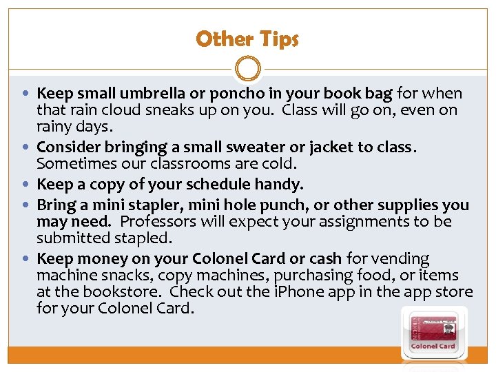 Other Tips Keep small umbrella or poncho in your book bag for when that rain cloud sneaks up on you. Class will go on, even on rainy days. Consider bringing a small sweater or jacket to class. Sometimes our classrooms are cold. Keep a copy of your schedule handy. Bring a mini stapler, mini hole punch, or other supplies you may need. Professors will expect your assignments to be submitted stapled. Keep money on your Colonel Card or cash for vending machine snacks, copy machines, purchasing food, or items at the bookstore. Check out the i. Phone app in the app store for your Colonel Card.