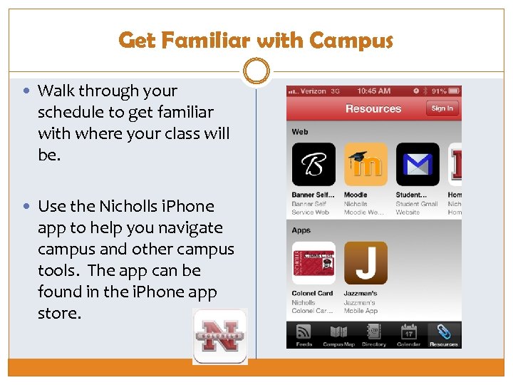 Get Familiar with Campus Walk through your schedule to get familiar with where your class will be. Use the Nicholls i. Phone app to help you navigate campus and other campus tools. The app can be found in the i. Phone app store.