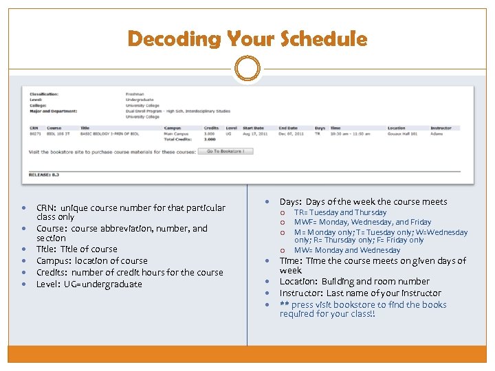 Decoding Your Schedule CRN: unique course number for that particular class only Course: course abbreviation, number, and section Title: Title of course Campus: location of course Credits: number of credit hours for the course Level: UG=undergraduate Days: Days of the week the course meets TR= Tuesday and Thursday MWF= Monday, Wednesday, and Friday M= Monday only; T= Tuesday only; W=Wednesday only; R= Thursday only; F= Friday only MW= Monday and Wednesday Time: Time the course meets on given days of week Location: Building and room number Instructor: Last name of your instructor ** press visit bookstore to find the books required for your class!!