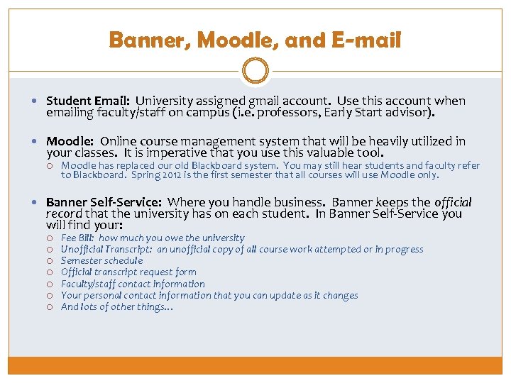 Banner, Moodle, and E-mail Student Email: University assigned gmail account. Use this account when emailing faculty/staff on campus (i. e. professors, Early Start advisor). Moodle: Online course management system that will be heavily utilized in your classes. It is imperative that you use this valuable tool. Moodle has replaced our old Blackboard system. You may still hear students and faculty refer to Blackboard. Spring 2012 is the first semester that all courses will use Moodle only. Banner Self-Service: Where you handle business. Banner keeps the official record that the university has on each student. In Banner Self-Service you will find your: Fee Bill: how much you owe the university Unofficial Transcript: an unofficial copy of all course work attempted or in progress Semester schedule Official transcript request form Faculty/staff contact information Your personal contact information that you can update as it changes And lots of other things…