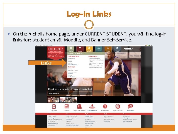 Log-in Links On the Nicholls home page, under CURRENT STUDENT, you will find log-in links for: student email, Moodle, and Banner Self-Service. Links