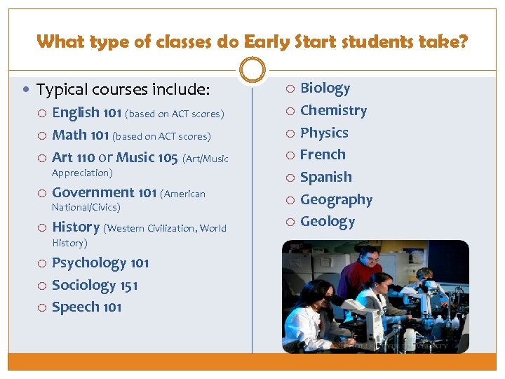 What type of classes do Early Start students take? Typical courses include: English 101 (based on ACT scores) Math 101 (based on ACT scores) Art 110 or Music 105 (Art/Music Appreciation) Government 101 (American National/Civics) History (Western Civilization, World History) Psychology 101 Sociology 151 Speech 101 Biology Chemistry Physics French Spanish Geography Geology