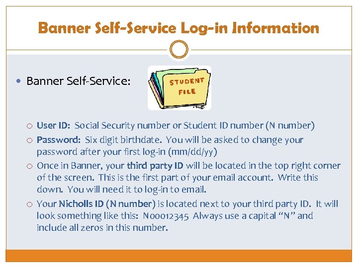 Banner Self-Service Log-in Information Banner Self-Service: User ID: Social Security number or Student ID number (N number) Password: Six digit birthdate. You will be asked to change your password after your first log-in (mm/dd/yy) Once in Banner, your third party ID will be located in the top right corner of the screen. This is the first part of your email account. Write this down. You will need it to log-in to email. Your Nicholls ID (N number) is located next to your third party ID. It will look something like this: N 00012345 Always use a capital “N” and include all zeros in this number.