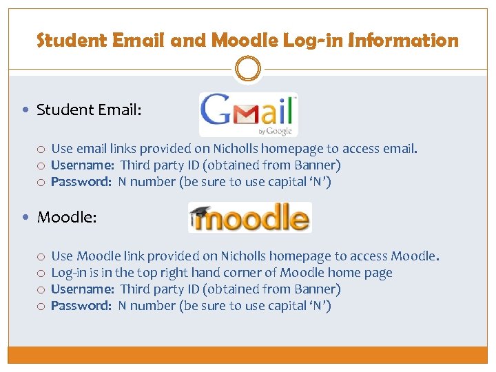 Student Email and Moodle Log-in Information Student Email: Use email links provided on Nicholls homepage to access email. Username: Third party ID (obtained from Banner) Password: N number (be sure to use capital ‘N’) Moodle: Use Moodle link provided on Nicholls homepage to access Moodle. Log-in is in the top right hand corner of Moodle home page Username: Third party ID (obtained from Banner) Password: N number (be sure to use capital ‘N’)
