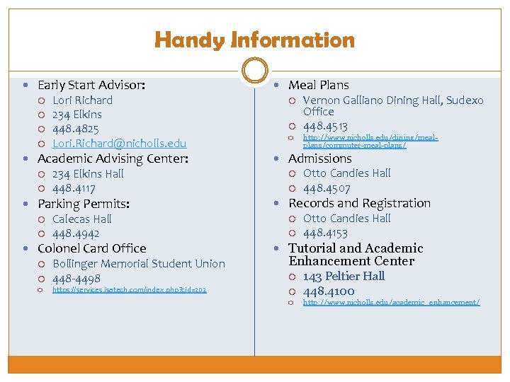 Handy Information Early Start Advisor: Lori Richard 234 Elkins 448. 4825 Lori. Richard@nicholls. edu Academic Advising Center: 234 Elkins Hall 448. 4117 Parking Permits: Calecas Hall 448. 4942 Colonel Card Office Bollinger Memorial Student Union 448 -4498 https: //services. jsatech. com/index. php? cid=202 Meal Plans Vernon Galliano Dining Hall, Sudexo Office 448. 4513 http: //www. nicholls. edu/dining/mealplans/commuter-meal-plans/ Admissions Otto Candies Hall 448. 4507 Records and Registration Otto Candies Hall 448. 4153 Tutorial and Academic Enhancement Center 143 Peltier Hall 448. 4100 http: //www. nicholls. edu/academic_enhancement/