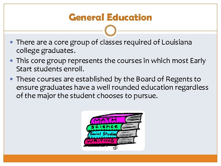 General Education There a core group of classes required of Louisiana college graduates. This core group represents the courses in which most Early Start students enroll. These courses are established by the Board of Regents to ensure graduates have a well rounded education regardless of the major the student chooses to pursue.