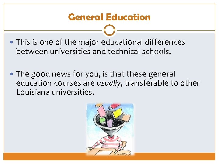General Education This is one of the major educational differences between universities and technical schools. The good news for you, is that these general education courses are usually, transferable to other Louisiana universities.
