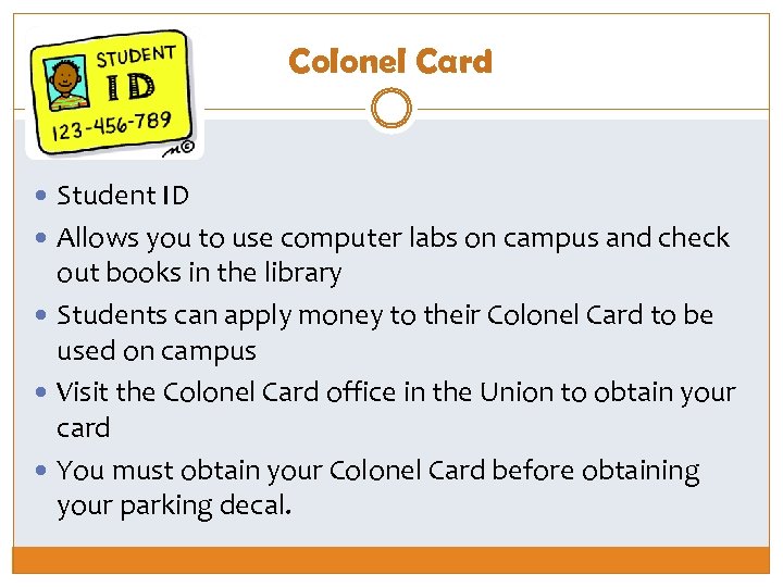 Colonel Card Student ID Allows you to use computer labs on campus and check out books in the library Students can apply money to their Colonel Card to be used on campus Visit the Colonel Card office in the Union to obtain your card You must obtain your Colonel Card before obtaining your parking decal.