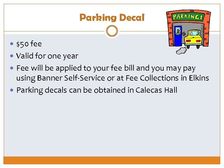 Parking Decal $50 fee Valid for one year Fee will be applied to your fee bill and you may pay using Banner Self-Service or at Fee Collections in Elkins Parking decals can be obtained in Calecas Hall
