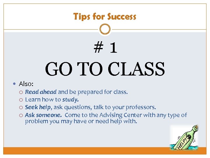 Tips for Success Also: #1 GO TO CLASS Read ahead and be prepared for class. Learn how to study. Seek help, ask questions, talk to your professors. Ask someone. Come to the Advising Center with any type of problem you may have or need help with.