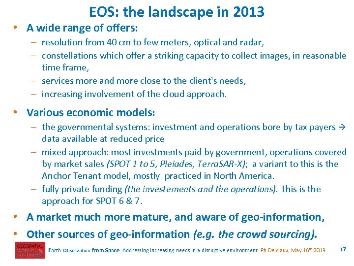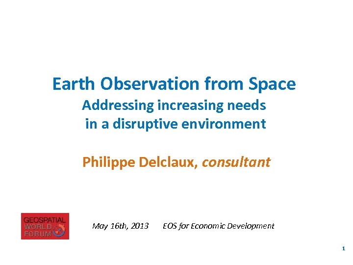 Earth Observation from Space Addressing increasing needs in a disruptive environment Philippe Delclaux, consultant May 16 th, 2013 EOS for Economic Development 1