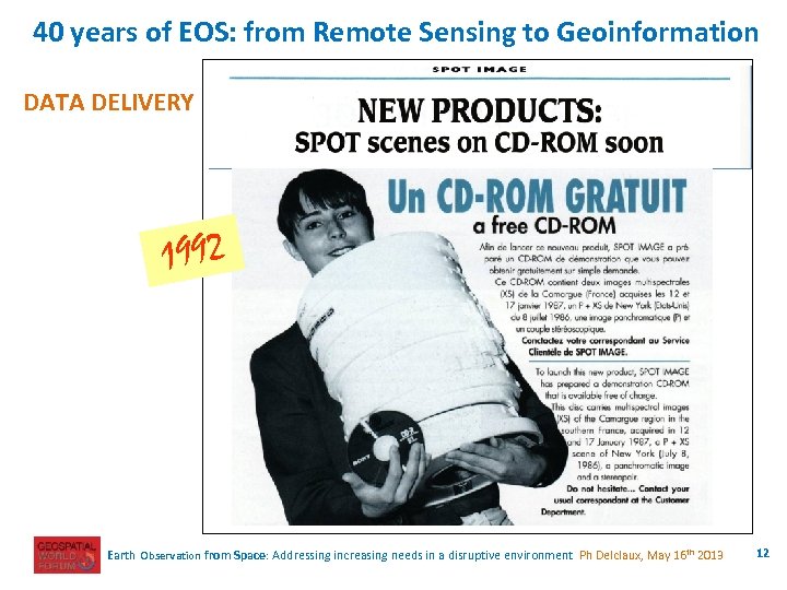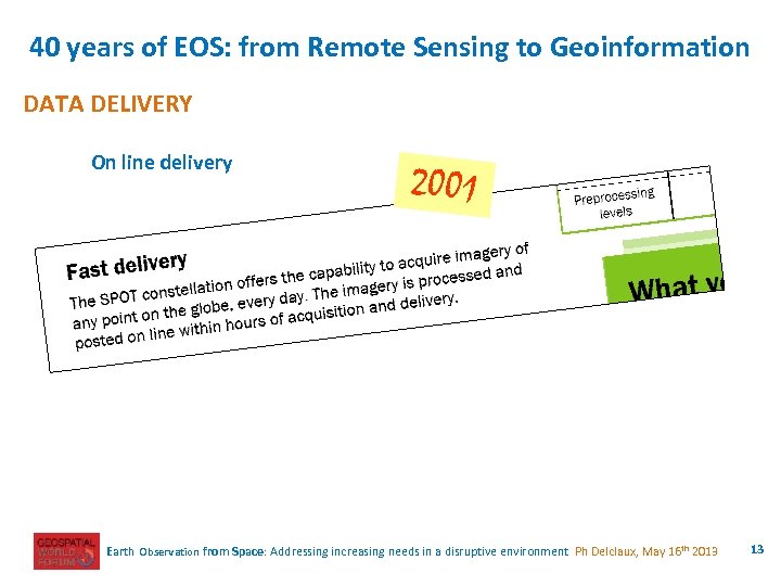 40 years of EOS: from Remote Sensing to Geoinformation DATA DELIVERY 1992 Earth Observation from Space: Addressing increasing needs in a disruptive environment Ph Delclaux, May 16 th 2013 12