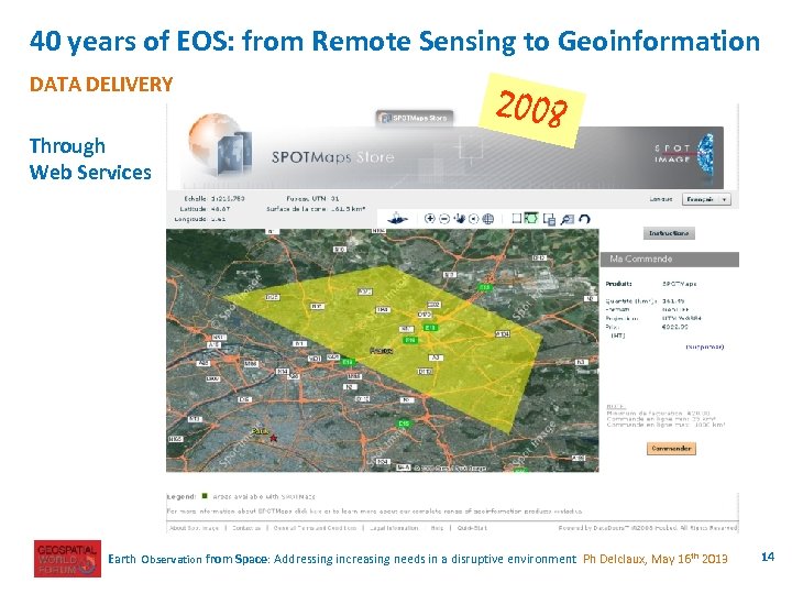 40 years of EOS: from Remote Sensing to Geoinformation DATA DELIVERY Through Web Services 2008 Earth Observation from Space: Addressing increasing needs in a disruptive environment Ph Delclaux, May 16 th 2013 14