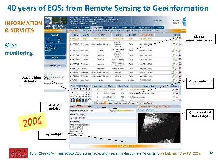 40 years of EOS: from Remote Sensing to Geoinformation INFORMATION & SERVICES List of monitored sites Sites monitoring Acquisition Schedule Observations Level of activity Quick look of the image 2006 Buy image Earth Observation from Space: Addressing increasing needs in a disruptive environment Ph Delclaux, May 16 th 2013 15
