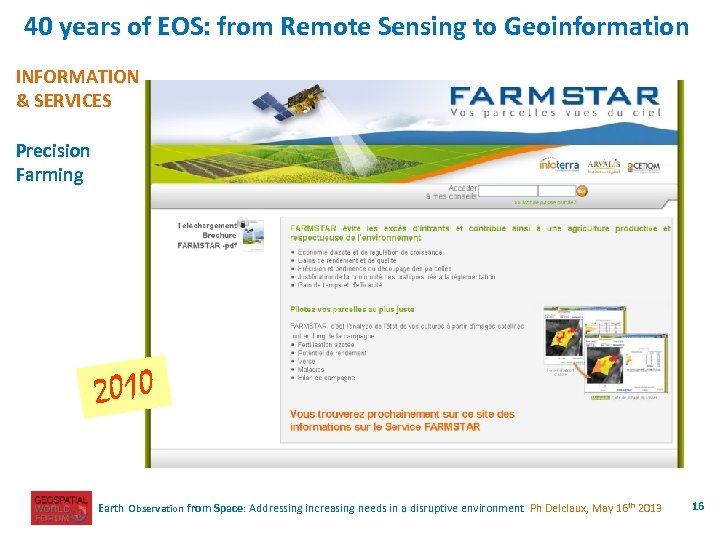 40 years of EOS: from Remote Sensing to Geoinformation INFORMATION & SERVICES Precision Farming 2010 Earth Observation from Space: Addressing increasing needs in a disruptive environment Ph Delclaux, May 16 th 2013 16