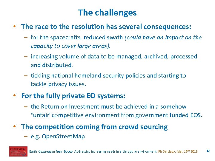 EOS: the landscape in 2013 • A wide range of offers: – resolution from 40 cm to few meters, optical and radar, – constellations which offer a striking capacity to collect images, in reasonable time frame, – services more and more close to the client's needs, – increasing involvement of the cloud approach. • Various economic models: – the governmental systems: investment and operations bore by tax payers data available at reduced price – mixed approach: most investments paid by government, operations covered by market sales (SPOT 1 to 5, Pleiades, Terra. SAR-X); a variant to this is the Anchor Tenant model, mostly practiced in North America. – fully private funding (the investements and the operations). This is the approach for SPOT 6 & 7. • A market much more mature, and aware of geo-information, • Other sources of geo-information (e. g. the crowd sourcing). Earth Observation from Space: Addressing increasing needs in a disruptive environment Ph Delclaux, May 16 th 2013 17