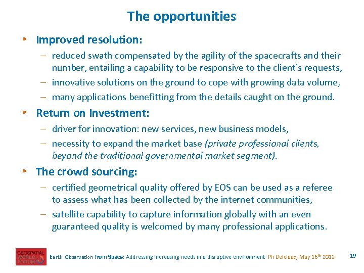 The challenges • The race to the resolution has several consequences: – for the spacecrafts, reduced swath (could have an impact on the capacity to cover large areas), – increasing volume of data to be managed, archived, processed and distributed, – tickling national homeland security policies and starting to tackle privacy issues. • For the fully private EO systems: – the Return on Investment must be achieved in a somehow "unfair"competitive environment from government funded EOS. • The competition coming from crowd sourcing – e. g. Open. Street. Map Earth Observation from Space: Addressing increasing needs in a disruptive environment Ph Delclaux, May 16 th 2013 18