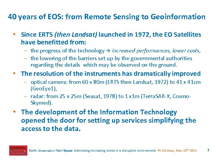40 years of EOS: from Remote Sensing to Geoinformation • Since ERTS (then Landsat) launched in 1972, the EO Satellites have benefitted from: – the progress of the technology increased performances, lower costs, – the lowering of the barriers set up by the governmental authorities regarding the details which may be observed on the ground. • The resolution of the instruments has dramatically improved – optical camera: from 60 x 80 m (ERTS then Landsat, 1972) to 41 x 41 cm (Geo. Eye 1), – radar: from 25 x 25 m (Seasat, 1978) to 1 x 1 m (Terra. SAR-X, Cosmo. Skymed). • The development of the Information Technology opened the door for setting up services simplifying the access to the data. Earth Observation from Space: Addressing increasing needs in a disruptive environment Ph Delclaux, May 16 th 2013 2