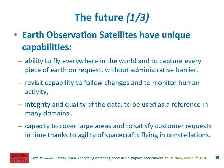 The opportunities • Improved resolution: – reduced swath compensated by the agility of the spacecrafts and their number, entailing a capability to be responsive to the client's requests, – innovative solutions on the ground to cope with growing data volume, – many applications benefitting from the details caught on the ground. • Return on Investment: – driver for innovation: new services, new business models, – necessity to expand the market base (private professional clients, beyond the traditional governmental market segment). • The crowd sourcing: – certified geometrical quality offered by EOS can be used as a referee to assess what has been collected by the internet communities, – satellite capability to capture information globally with an even guaranteed quality is welcomed by many professional applications. Earth Observation from Space: Addressing increasing needs in a disruptive environment Ph Delclaux, May 16 th 2013 19