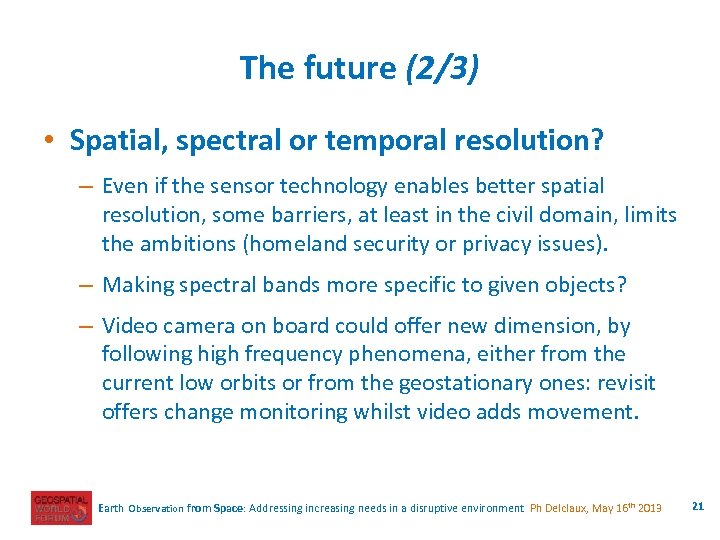 The future (1/3) • Earth Observation Satellites have unique capabilities: – ability to fly everywhere in the world and to capture every piece of earth on request, without administrative barrier, – revisit capability to follow changes and to monitor human activity, – integrity and quality of the data, to be used as a reference in many domains , – capacity to cover large areas and to satisfy customer requests in time thanks to agility of spacecrafts flying in constellations. Earth Observation from Space: Addressing increasing needs in a disruptive environment Ph Delclaux, May 16 th 2013 20