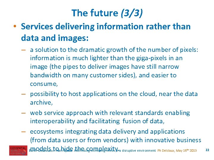 The future (2/3) • Spatial, spectral or temporal resolution? – Even if the sensor technology enables better spatial resolution, some barriers, at least in the civil domain, limits the ambitions (homeland security or privacy issues). – Making spectral bands more specific to given objects? – Video camera on board could offer new dimension, by following high frequency phenomena, either from the current low orbits or from the geostationary ones: revisit offers change monitoring whilst video adds movement. Earth Observation from Space: Addressing increasing needs in a disruptive environment Ph Delclaux, May 16 th 2013 21