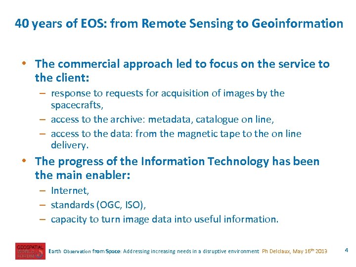40 years of EOS: from Remote Sensing to Geoinformation • The distribution of data on a commercial basis by a few actors (like for SPOT in 1986) entailed a business approach: – led to market "Geo-Information", – "Remote Sensing" stayed confined in the academic world. • 1989 30 years later, Google. Earth, GPS and mobility applications: – moved the use of Geo-Information from the restricted professional community to the general public (emerging "neogeographers"), – by capillarity, made a much broader professional community, including decision makers, familiar with professional use of Geo-Information, – led to add a geographic component to every information stored in any data base. Earth Observation from Space: Addressing increasing needs in a disruptive environment Ph Delclaux, May 16 th 2013 3