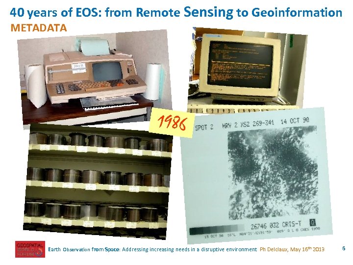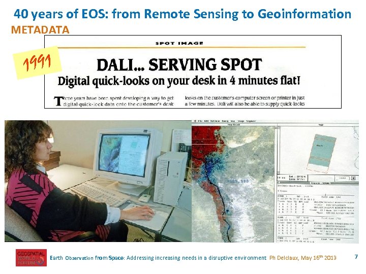 40 years of EOS: from Remote Sensing to Geoinformation METADATA 1986 Earth Observation from Space: Addressing increasing needs in a disruptive environment Ph Delclaux, May 16 th 2013 6
