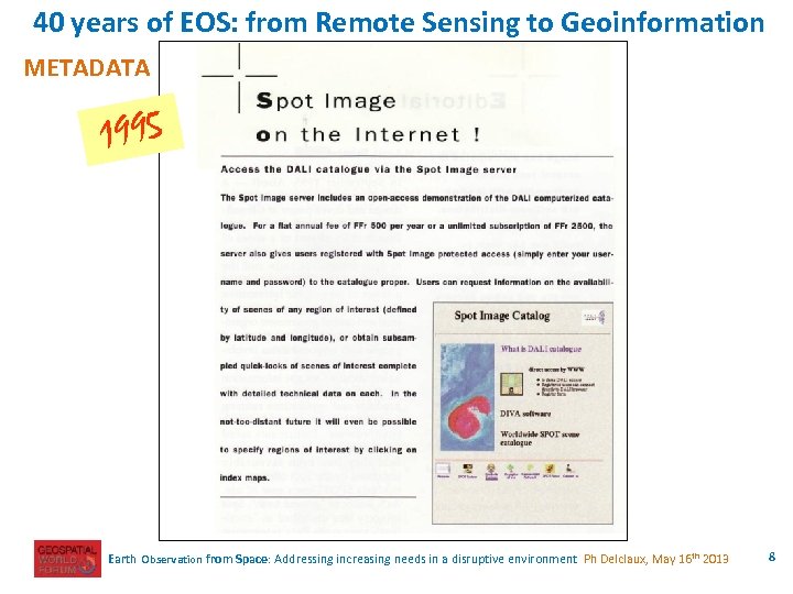 40 years of EOS: from Remote Sensing to Geoinformation METADATA 1991 Earth Observation from Space: Addressing increasing needs in a disruptive environment Ph Delclaux, May 16 th 2013 7