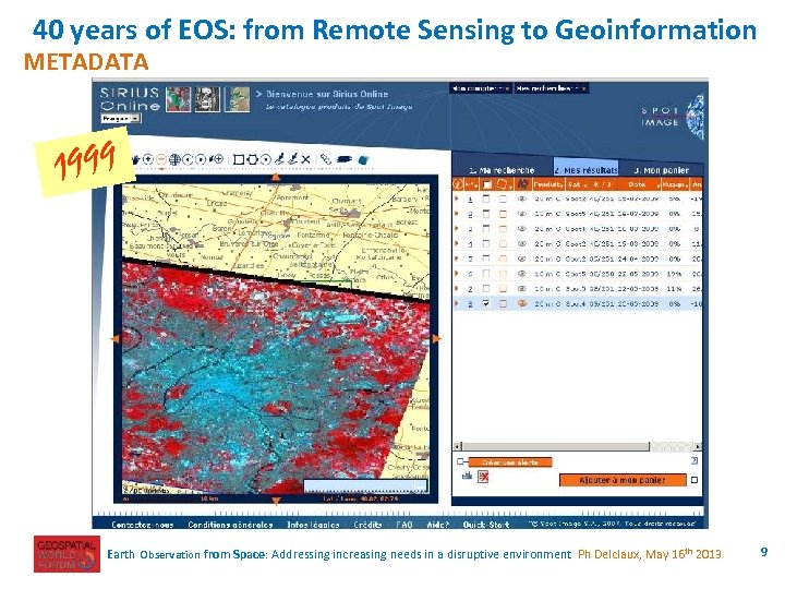 40 years of EOS: from Remote Sensing to Geoinformation METADATA 1995 Earth Observation from Space: Addressing increasing needs in a disruptive environment Ph Delclaux, May 16 th 2013 8