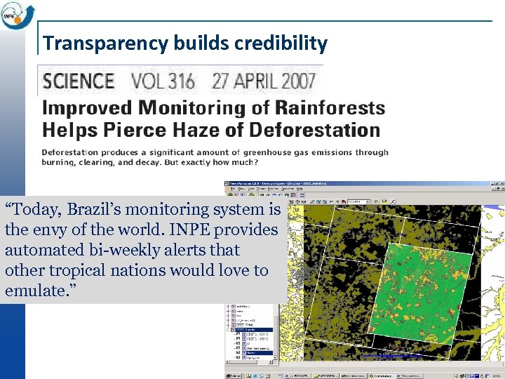 Transparency builds credibility “Today, Brazil’s monitoring system is the envy of the world. INPE provides automated bi-weekly alerts that other tropical nations would love to emulate. ”