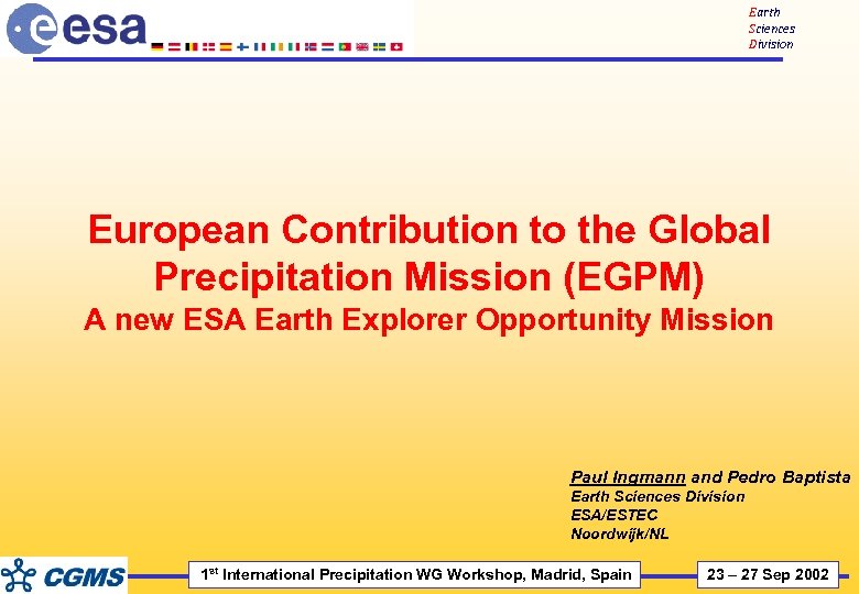 Earth Sciences Division European Contribution to the Global Precipitation Mission (EGPM) A new ESA Earth Explorer Opportunity Mission Paul Ingmann and Pedro Baptista Earth Sciences Division ESA/ESTEC Noordwijk/NL 1 st International Precipitation WG Workshop, Madrid, Spain 23 – 27 Sep 2002