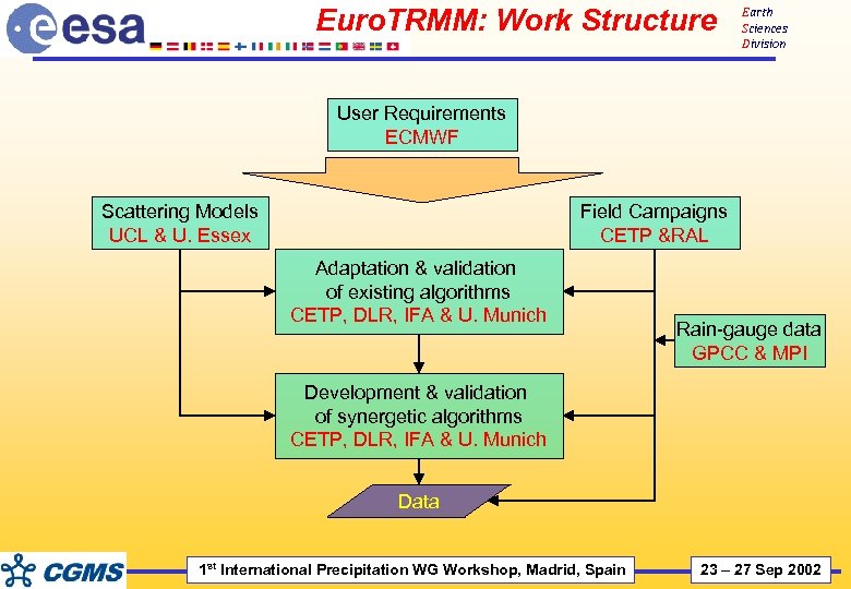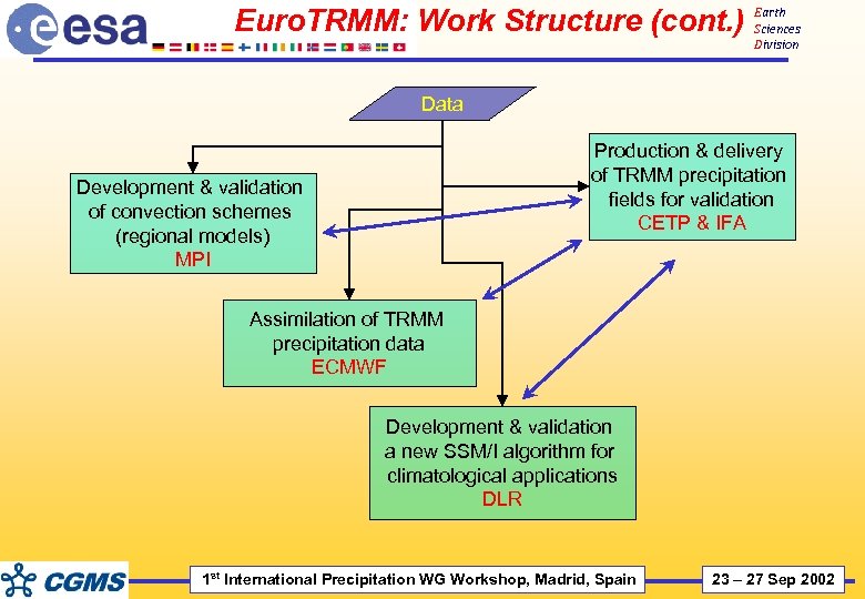 Euro. TRMM: Work Structure (cont. ) Earth Sciences Division Data Production & delivery of TRMM precipitation fields for validation CETP & IFA Development & validation of convection schemes (regional models) MPI Assimilation of TRMM precipitation data ECMWF Development & validation a new SSM/I algorithm for climatological applications DLR 1 st International Precipitation WG Workshop, Madrid, Spain 23 – 27 Sep 2002