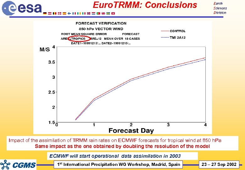 Euro. TRMM: Conclusions Earth Sciences Division Impact of the assimilation of TRMM rain rates on ECMWF forecasts for tropical wind at 850 h. Pa Same impact as the one obtained by doubling the resolution of the model ECMWF will start operational data assimilation in 2003 1 st International Precipitation WG Workshop, Madrid, Spain 23 – 27 Sep 2002