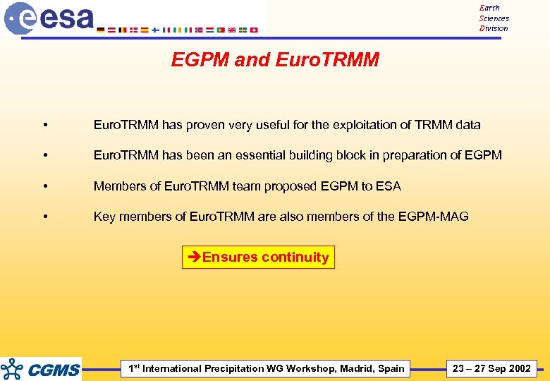 Earth Sciences Division EGPM and Euro. TRMM • Euro. TRMM has proven very useful for the exploitation of TRMM data • Euro. TRMM has been an essential building block in preparation of EGPM • Members of Euro. TRMM team proposed EGPM to ESA • Key members of Euro. TRMM are also members of the EGPM-MAG èEnsures continuity 1 st International Precipitation WG Workshop, Madrid, Spain 23 – 27 Sep 2002