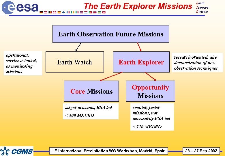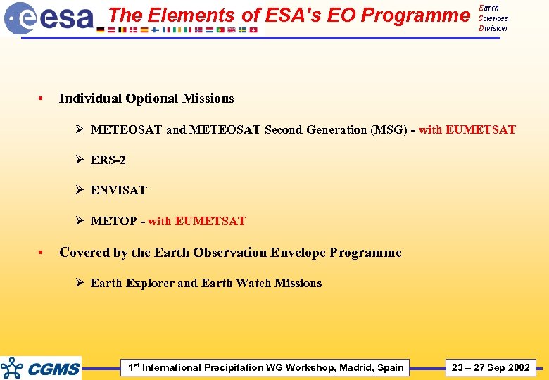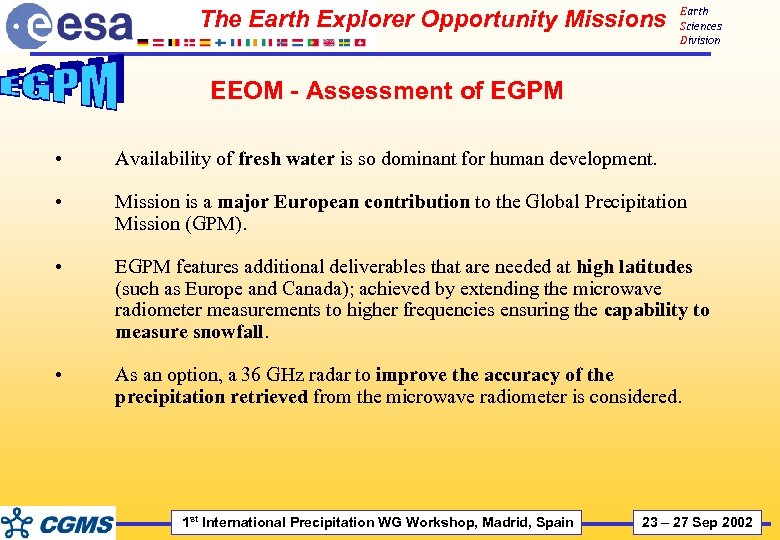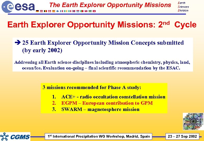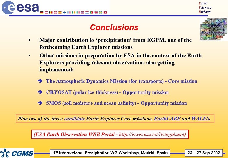 Earth Sciences Division Conclusions • • Major contribution to ‘precipitation’ from EGPM, one of the forthcoming Earth Explorer missions Other missions in preparation by ESA in the context of the Earth Explorers providing relevant observations also getting implemented: è The Atmospheric Dynamics Mission (for transports) - Core mission è CRYOSAT (polar ice thickness) - Opportunity mission è SMOS (soil moisture and ocean salinity) - Opportunity mission Plus two of the three candidate Earth Explorer Core missions, Earth. CARE and WALES. (ESA Earth Observation WEB Portal - http: //www. esa. int/livingplanet) 1 st International Precipitation WG Workshop, Madrid, Spain 23 – 27 Sep 2002