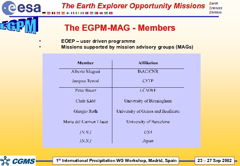 The Earth Explorer Opportunity Missions Earth Sciences Division The EGPM-MAG - Members • • EOEP – user driven programme Missions supported by mission advisory groups (MAGs) 1 st International Precipitation WG Workshop, Madrid, Spain 23 – 27 Sep 2002