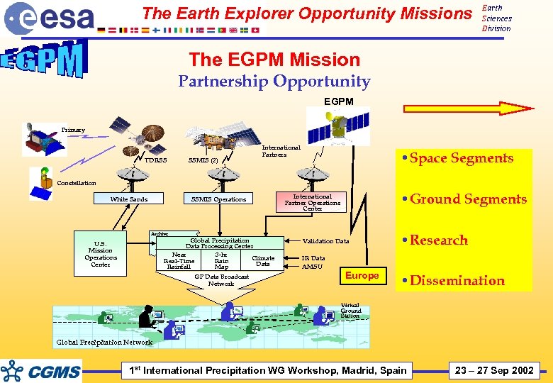 The Earth Explorer Opportunity Missions Earth Sciences Division The EGPM Mission Partnership Opportunity EGPM Primary TDRSS SSMIS (2) International Partners • Space Segments Constellation White Sands SSMIS Operations • Ground Segments International Partner Operations Center Archive Global Precipitation Data Processing Center Near 3 -hr Climate Real-Time Rain Data Rainfall Map U. S. Mission Operations Center GP Data Broadcast Network Validation Data IR Data AMSU Europe • Research • Dissemination Virtual Ground Station Global Precipitation Network 1 st International Precipitation WG Workshop, Madrid, Spain 23 – 27 Sep 2002
