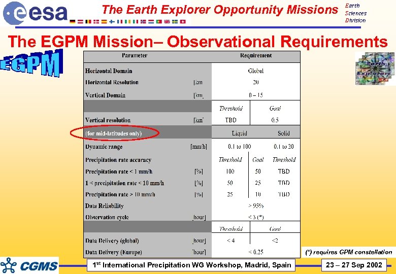 The Earth Explorer Opportunity Missions Earth Sciences Division The EGPM Mission– Observational Requirements (*) requires GPM constellation 1 st International Precipitation WG Workshop, Madrid, Spain 23 – 27 Sep 2002