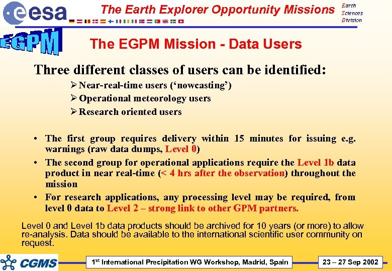 The Earth Explorer Opportunity Missions Earth Sciences Division The EGPM Mission - Data Users Three different classes of users can be identified: Ø Near-real-time users (‘nowcasting’) Ø Operational meteorology users Ø Research oriented users • The first group requires delivery within 15 minutes for issuing e. g. warnings (raw data dumps, Level 0) • The second group for operational applications require the Level 1 b data product in near real-time (< 4 hrs after the observation) throughout the mission • For research applications, any processing level may be required, from level 0 data to Level 2 – strong link to other GPM partners. Level 0 and Level 1 b data products should be archived for 10 years (or more) to allow re-analysis. Data should be available to the international scientific user community on request. 1 st International Precipitation WG Workshop, Madrid, Spain 23 – 27 Sep 2002