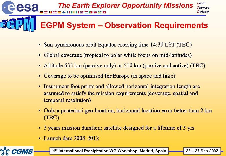 The Earth Explorer Opportunity Missions Earth Sciences Division EGPM System – Observation Requirements • Sun-synchronous orbit Equator crossing time 14: 30 LST (TBC) • Global coverage (tropical to polar while focus on mid-latitudes) • Altitude 635 km (passive only) or 510 km (passive and active) (TBC) • Coverage to be optimised for Europe (in space and time) • Instrument foot prints and allowed horizontal integration length are assumed to satisfy the mission requirements (coverage, spatial and temporal resolution) • Only a posteriori geo-location, horizontal location error better than 2 km (TBC) • 3 years mission duration; satellite designed for a lifetime of 5 yrs • Launch date 2008 -2012 1 st International Precipitation WG Workshop, Madrid, Spain 23 – 27 Sep 2002