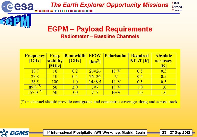 The Earth Explorer Opportunity Missions Earth Sciences Division EGPM – Payload Requirements Radiometer – Baseline Channels 1 st International Precipitation WG Workshop, Madrid, Spain 23 – 27 Sep 2002