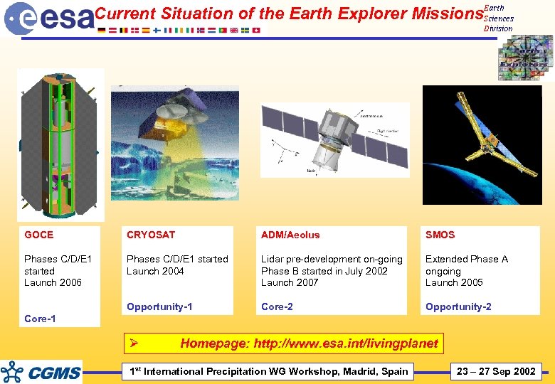 Current Situation of the Earth Explorer Missions. Earth Sciences Division GOCE CRYOSAT ADM/Aeolus SMOS Phases C/D/E 1 started Launch 2006 Phases C/D/E 1 started Launch 2004 Lidar pre-development on-going Phase B started in July 2002 Launch 2007 Extended Phase A ongoing Launch 2005 Opportunity-1 Core-2 Opportunity-2 Core-1 Ø Homepage: http: //www. esa. int/livingplanet 1 st International Precipitation WG Workshop, Madrid, Spain 23 – 27 Sep 2002