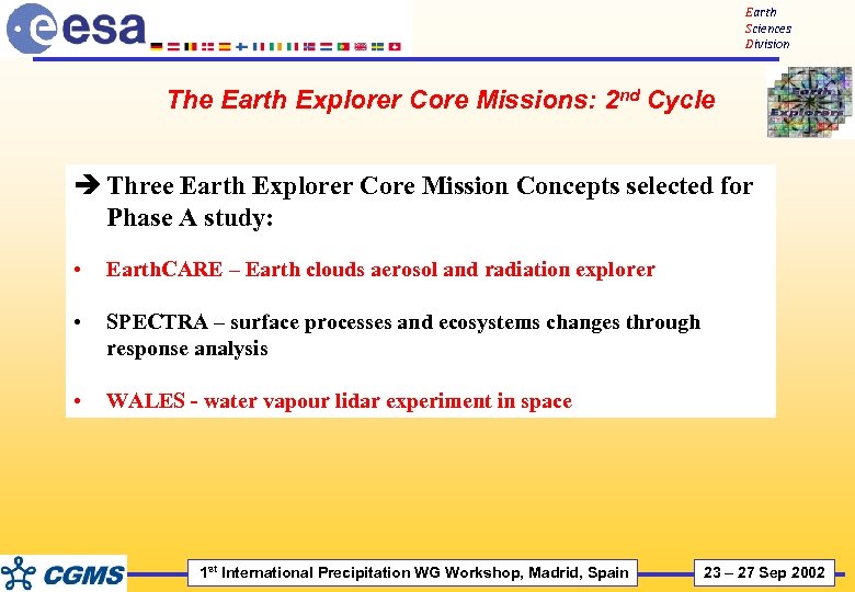 Earth Sciences Division The Earth Explorer Core Missions: 2 nd Cycle è Three Earth Explorer Core Mission Concepts selected for Phase A study: • Earth. CARE – Earth clouds aerosol and radiation explorer • SPECTRA – surface processes and ecosystems changes through response analysis • WALES - water vapour lidar experiment in space 1 st International Precipitation WG Workshop, Madrid, Spain 23 – 27 Sep 2002