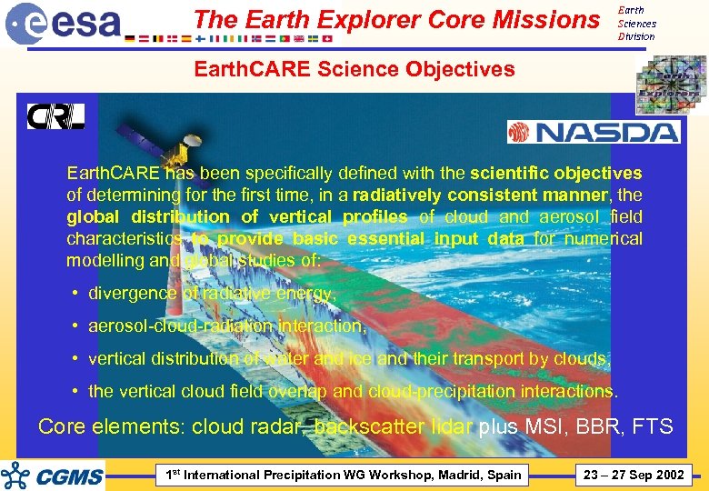 The Earth Explorer Core Missions Earth Sciences Division Earth. CARE Science Objectives Earth. CARE has been specifically defined with the scientific objectives of determining for the first time, in a radiatively consistent manner, the global distribution of vertical profiles of cloud and aerosol field characteristics to provide basic essential input data for numerical modelling and global studies of: • divergence of radiative energy, • aerosol-cloud-radiation interaction, • vertical distribution of water and ice and their transport by clouds, • the vertical cloud field overlap and cloud-precipitation interactions. Core elements: cloud radar, backscatter lidar plus MSI, BBR, FTS 1 st International Precipitation WG Workshop, Madrid, Spain 23 – 27 Sep 2002
