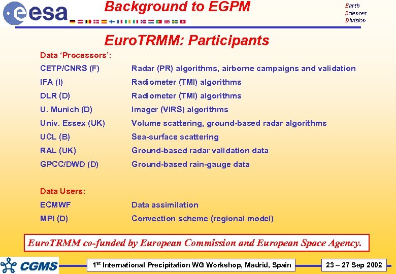 Background to EGPM Earth Sciences Division Euro. TRMM: Participants Data ‘Processors’: CETP/CNRS (F) Radar (PR) algorithms, airborne campaigns and validation IFA (I) Radiometer (TMI) algorithms DLR (D) Radiometer (TMI) algorithms U. Munich (D) Imager (VIRS) algorithms Univ. Essex (UK) Volume scattering, ground-based radar algorithms UCL (B) Sea-surface scattering RAL (UK) Ground-based radar validation data GPCC/DWD (D) Ground-based rain-gauge data Data Users: ECMWF Data assimilation MPI (D) Convection scheme (regional model) Euro. TRMM co-funded by European Commission and European Space Agency. 1 st International Precipitation WG Workshop, Madrid, Spain 23 – 27 Sep 2002