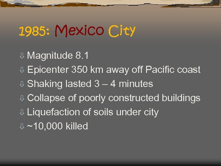 1985: Mexico City ò Magnitude 8. 1 ò Epicenter 350 km away off Pacific coast ò Shaking lasted 3 – 4 minutes ò Collapse of poorly constructed buildings ò Liquefaction of soils under city ò ~10, 000 killed