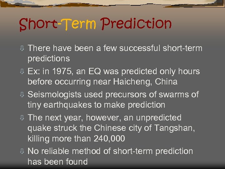 Short-Term Prediction ò ò ò There have been a few successful short-term predictions Ex: in 1975, an EQ was predicted only hours before occurring near Haicheng, China Seismologists used precursors of swarms of tiny earthquakes to make prediction The next year, however, an unpredicted quake struck the Chinese city of Tangshan, killing more than 240, 000 No reliable method of short-term prediction has been found