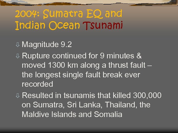 2004: Sumatra EQ and Indian Ocean Tsunami ò Magnitude 9. 2 ò Rupture continued for 9 minutes & moved 1300 km along a thrust fault – the longest single fault break ever recorded ò Resulted in tsunamis that killed 300, 000 on Sumatra, Sri Lanka, Thailand, the Maldive Islands and Somalia